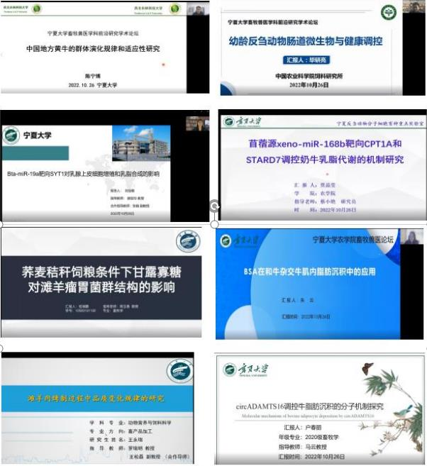 10月26日14:00-21:30,宁夏大学农学院畜牧兽医学科第一届研究生学术论坛以腾讯会议形式顺利举行。论坛聚焦畜牧、兽医学科发展前沿和研究热点,注重培养科学精神和科研素养,以助力宁夏畜禽优势特色产业发展为目标。学科邀请知名专家进行讲座和学生开展学术报告,以促进研究生对学科研究前沿和热点问题的了解,掌握学科最新研究方法和技术,培养科研思维,提升创新能力。
