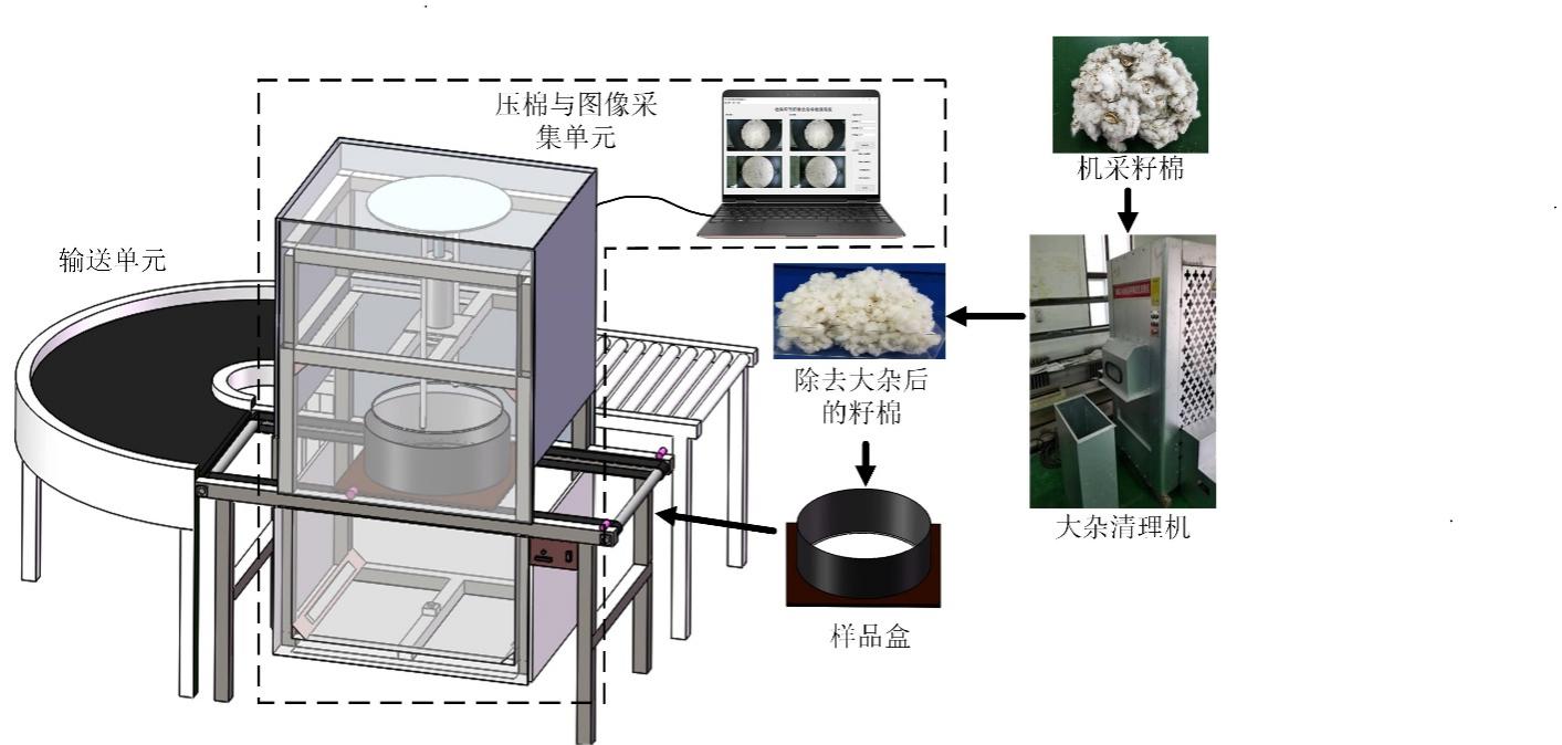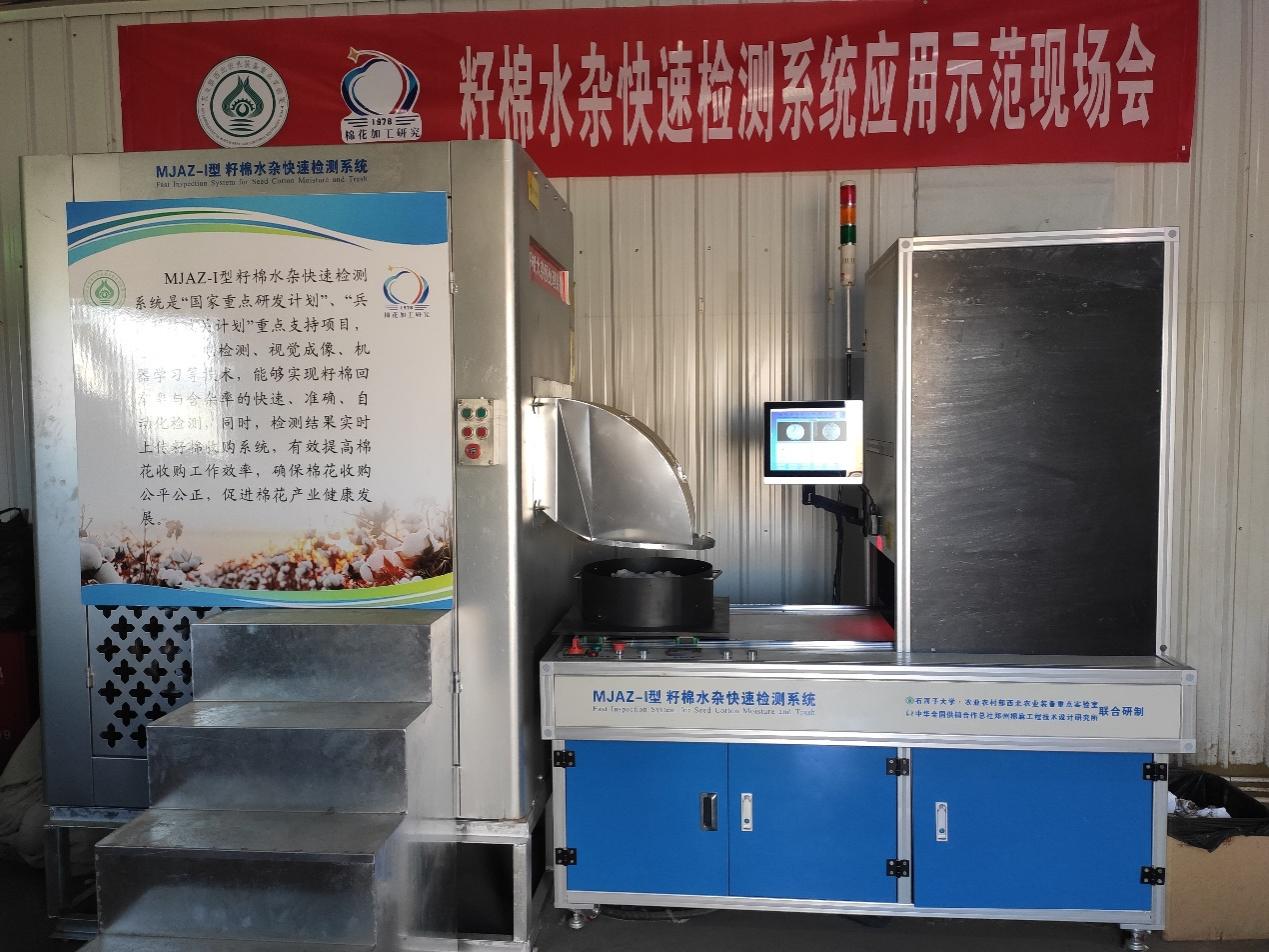 MJAZ-I型籽棉水杂快速检测系统是“国家重点研发计划”、“兵团科技攻关计划”重点支持项目,它采用光电检测、视觉成像、机器学习等技术,能够实现籽棉回潮率与含杂率的快速、准确、自动化检测。目前此系统单个样本检测时间为2-3分钟,检测结果高效准确,其中含杂率检测回归分析决定系数R²为95%,均方根误差RMSE为0.59%,回潮率误差为±0.5。同时,检测结果实时上传籽棉收购系统及物联网服务器,进而在手机app查看实时检测结果。项目申请发明专利1项,授权实用新型专利1项,软件著作权1项,发表SCI论文1篇,研发籽棉水杂快速检测系统1套。