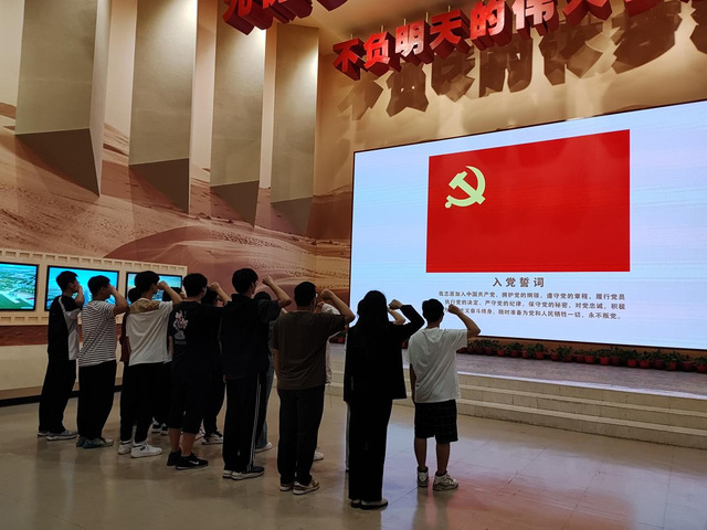 在参观的最后阶段,本科生第二党支部副书记鲁梦瑶带领全体党员重温入党誓词,入党积极分子行注目礼。那一刻,现实和历史仿佛交融在一起,投身军垦的老一辈党员们仿佛能听到我们宣誓时铿锵有力的声音。他们仿佛再次想起自己第一次面对党旗宣誓时的场景,兵团精神不灭,薪火相传。