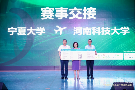 第六届牛精英挑战赛赛事交接仪式。在闭幕式的最后,曹志军教授宣布下一届2025年牛精英挑战赛的举办地点为河南科技大学。在中国学位与研究生教育学会副秘书长赵瑜的见证下,宁夏大学副校长李建设将代表举办权的“机票”交于河南科技大学副校长庞新厂。庞新厂副校长表示将竭尽全力做好赛前筹备工作,届时真诚邀请各位领导嘉宾、专家学者及高校师生们共同参与,相约河南科技大学。