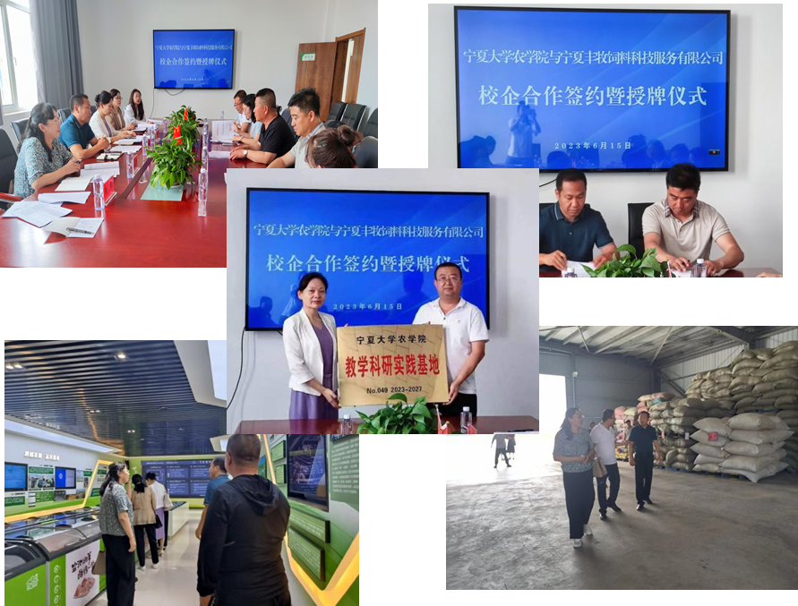 2023年6月15日,宁夏大学动物科技学院副院长徐晓锋和周玉香教授等人与宁夏丰牧饲料科技服务有限公司代表人李焱龙副总经理等人进行了校企合作签约授牌。在签约仪式上,双方就高校、企业人才培养、输送以及盐池滩羊产业发展等重点问题进行了深入的交流探讨,初步达成了“高校+人才+企业”三合一的培养模式。双方均表示将借此契机,充分利用校企双方优质资源,进行高校和企业的优势互补,进一步加强高技能人才的培养,促进人才培养供需双向对接,实现校企合作共赢,推动滩羊产业乃至畜牧业的高质量发展。