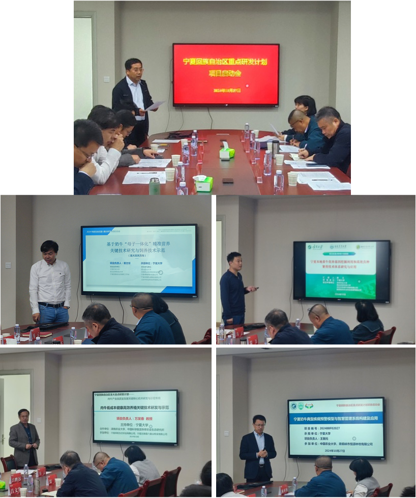2024年10月27日,动物科技学院主持的2024年宁夏回族自治区重点研发计划“基于奶牛“母子一体化”精准营养关键技术研究与饲养技术示范(重大)”、“宁夏本地黄牛优异基因挖掘利用和高效良种繁育技术体系研究与应用(重大)”、“肉牛低成本健康高效养殖关键技术研发与示范(重大)”和“宁夏奶牛典型疾病预警模型与智慧管理系统构建及应用(重点)”四个项目联合启动会在我院顺利召开。