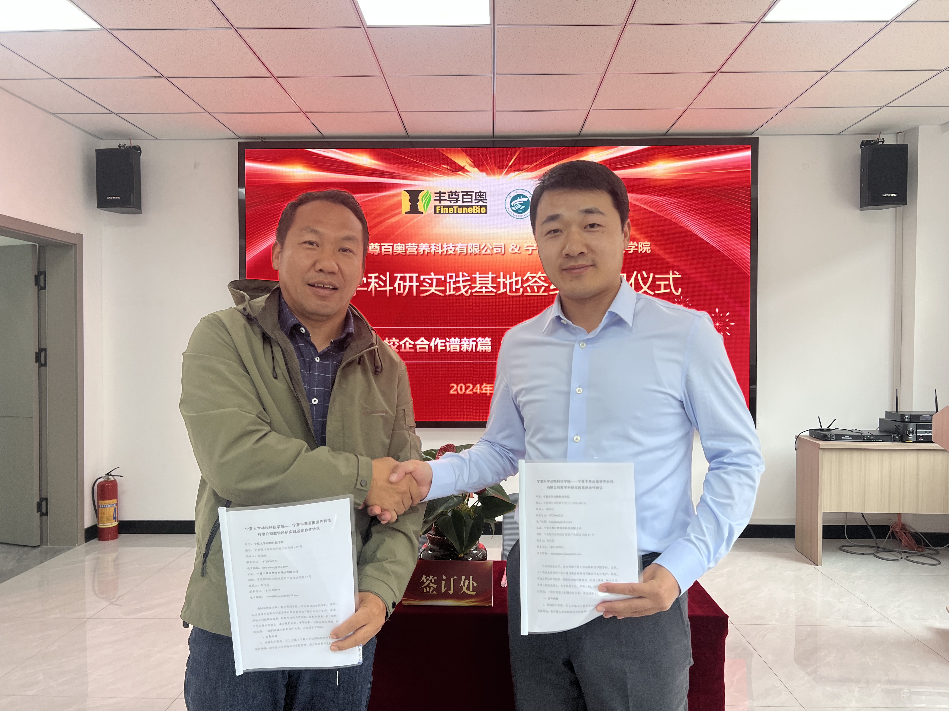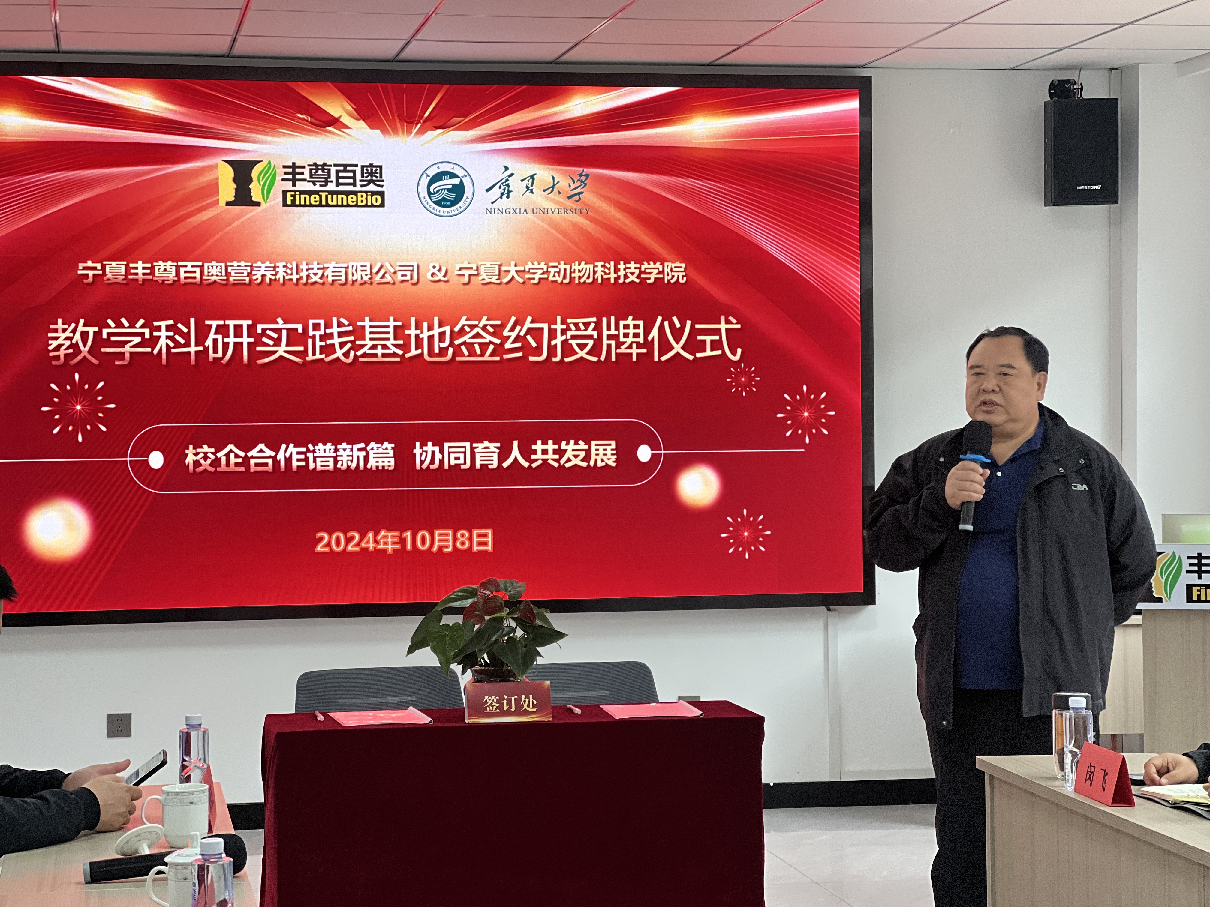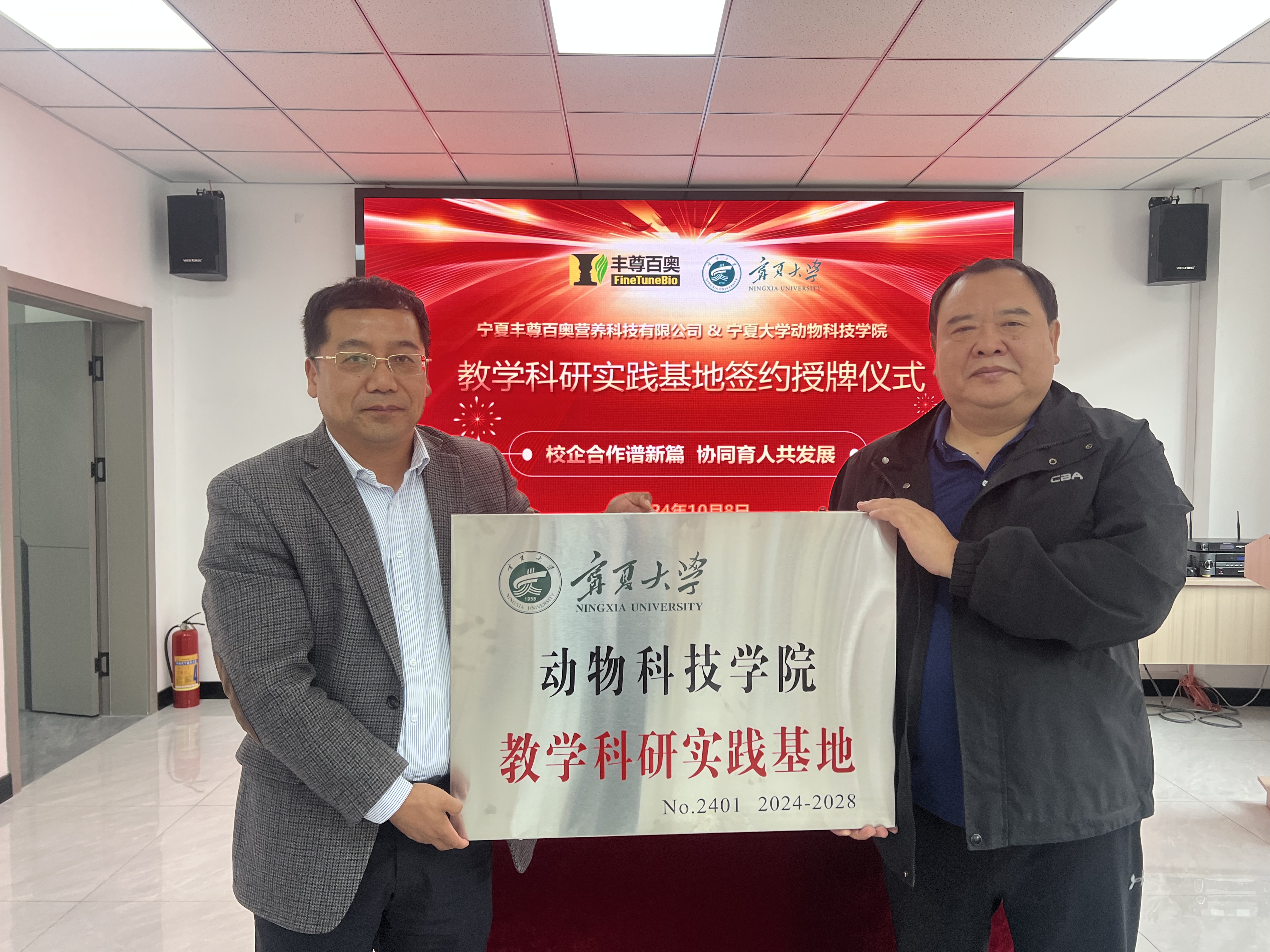 2024年10月8日下午,“宁夏大学动物科技学院教学科研实践基地”挂牌仪式于宁夏丰尊百奥营养科技有限公司举行。宁夏大学动物科技学院马云副院长(主持工作)、徐晓锋副院长、张桂杰副院长和陈晓东博士,宁夏丰尊百奥营养科技有限公司仇学军董事长、闵飞执行副总裁、路庆刚总经理、张宝艺总监及员工代表参加了本次活动。